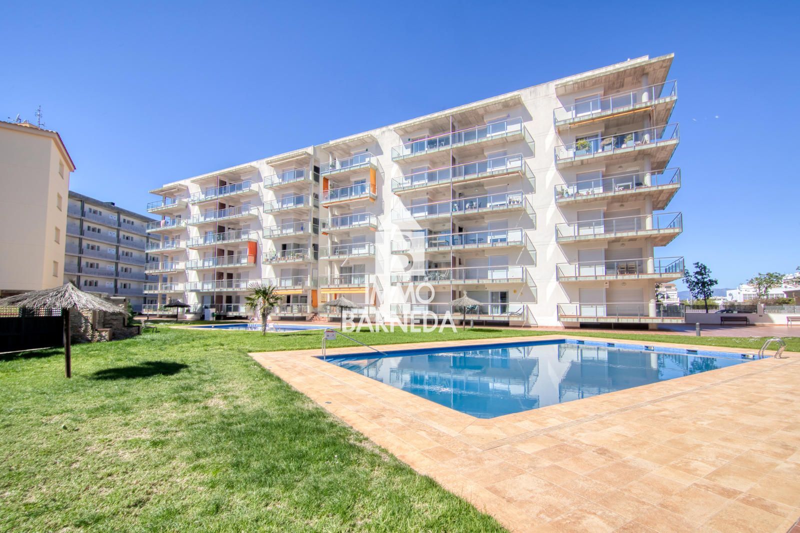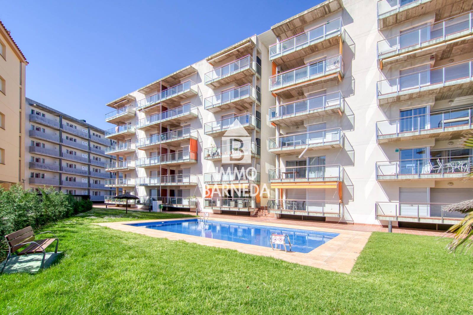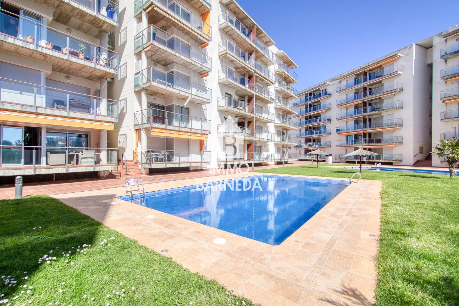 The property features a bright living-dining room with a fully equipped open-plan kitchen and direct access to a pleasant 10 m² terrace overlooking the pool and green areas. It offers two double bedrooms, one with direct access to the terrace, both with built-in wardrobes, and a complete bathroom with shower.